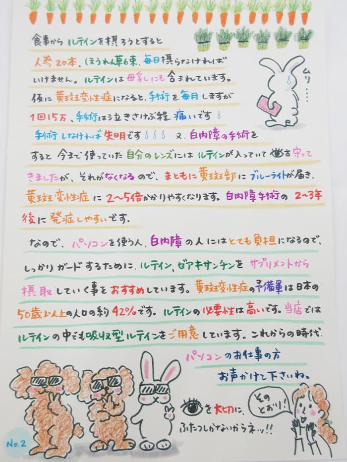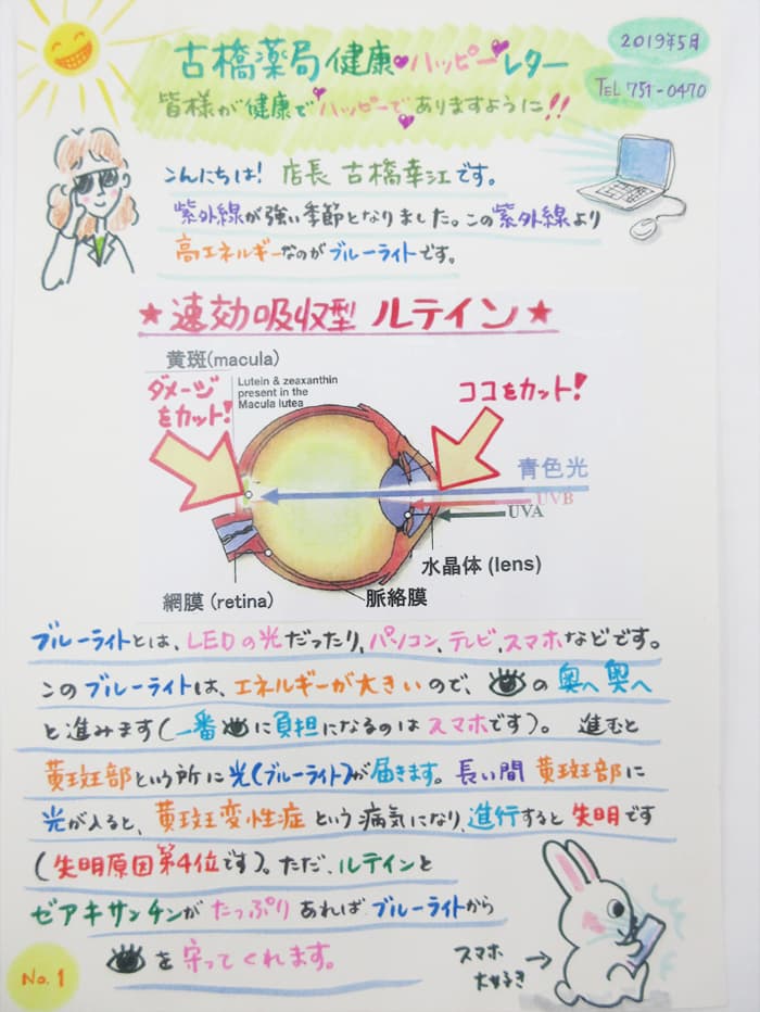 また、白内障の手術をすると今まで使っていた自分のレンズにはルテインが入っていて目を守ってきましたが、それがなくなるので、まともに黄斑部にブルーライトが届き、黄斑変性症に2~5倍かかりやすくなります。